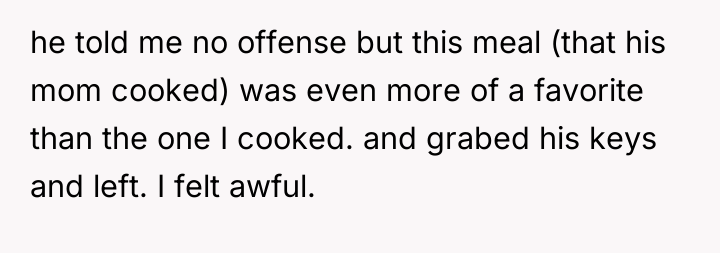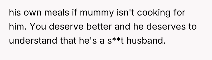 In my opinion, this situation highlights the importance of mutual respect and appreciation in a marriage. The husband’s habit of prioritizing his mother’s cooking over his wife’s efforts not only undermines her but also creates unnecessary tension. It’s crucial for him to recognize the emotional labor she puts into making their home a loving space and to support her instead of constantly comparing her to his mother. Ultimately, healthy communication and clear boundaries are key to resolving these kinds of family conflicts.