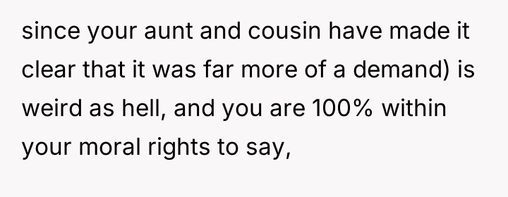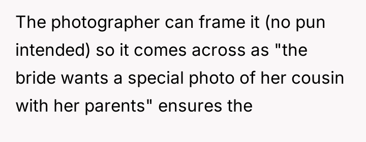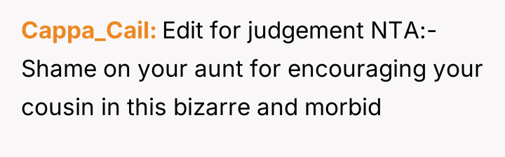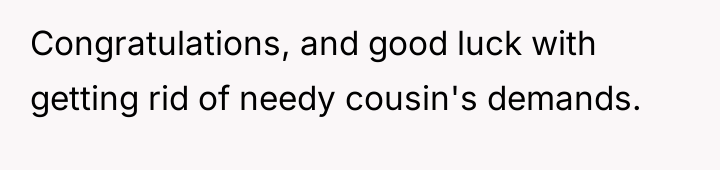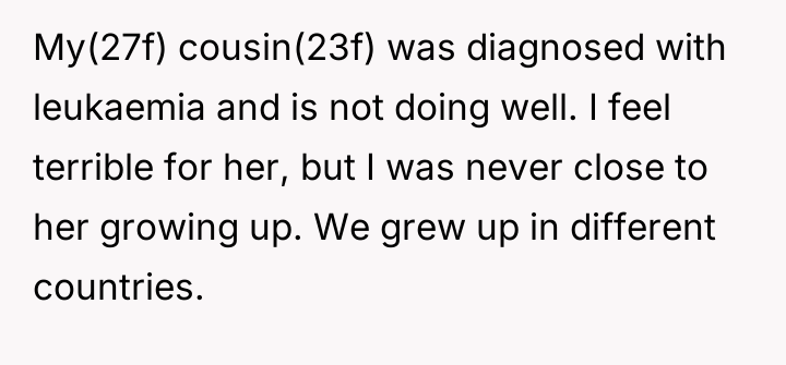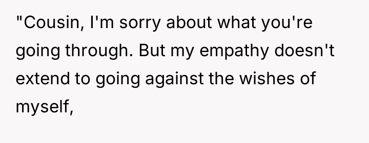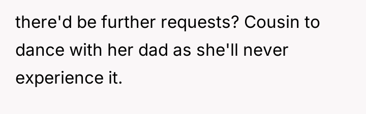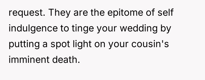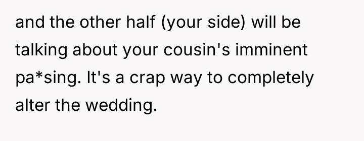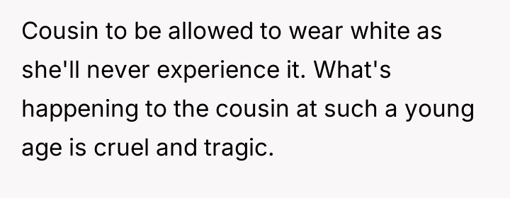 After reading through the Reddit comments, it’s clear that many people empathize with both sides but ultimately lean towards respecting the bride’s wishes on her own wedding day. While the cousin’s situation is undeniably heartbreaking, most commenters agree that the wedding should reflect the bride’s vision and comfort. Many suggest finding other meaningful ways to support the cousin during this difficult time without compromising the bride’s special moment.