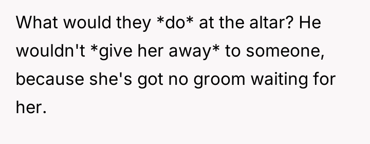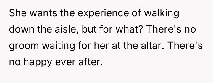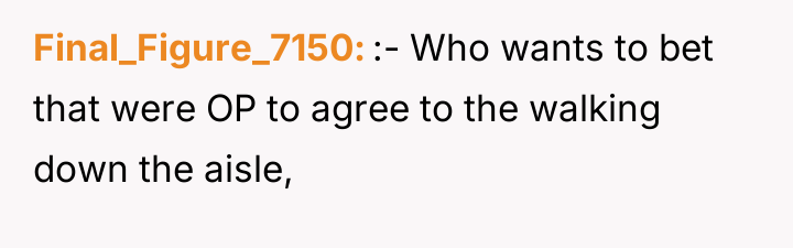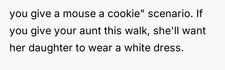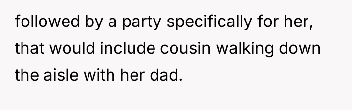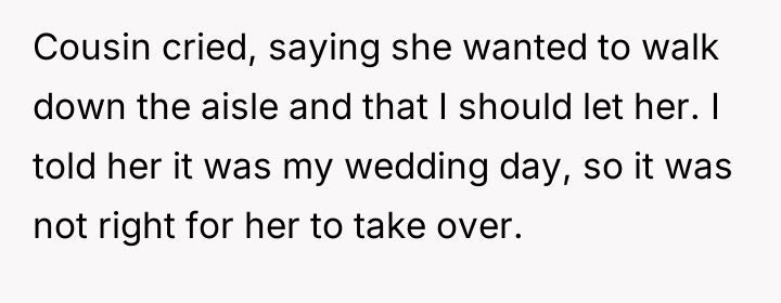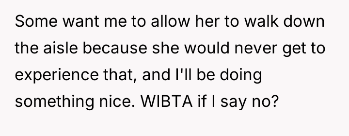 In my opinion, this is a delicate balance of compassion and personal boundaries. The bride is not being selfish for wanting to prioritize her own feelings on her big day, especially when the request involves a significant alteration to the ceremony. It’s important to show empathy for the cousin’s illness through other gestures rather than giving up a moment that symbolizes the bride’s happiness and agency. Ultimately, communication and compromise outside of the aisle walk could help everyone feel heard and cared for.