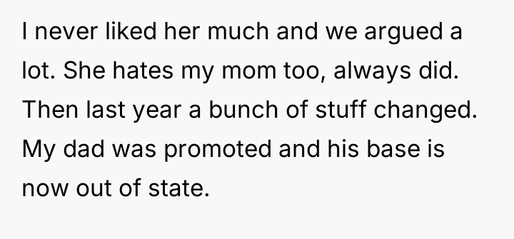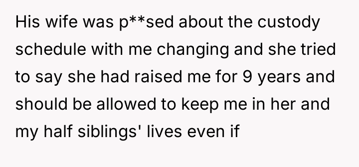 In reflecting on the story, it highlights how custody changes and family separations can deeply affect a teenager’s sense of stability and identity. The tension between the stepmother’s desire to remain involved and the OP’s own preferences underscores the delicate balance of blended family relationships. Ultimately, it’s crucial that the OP’s voice is heard and respected, as his well-being should be the priority amidst all the adult conflicts and shifting household arrangements.