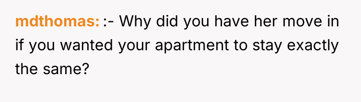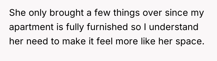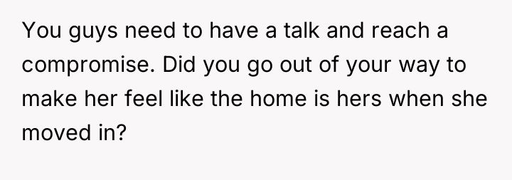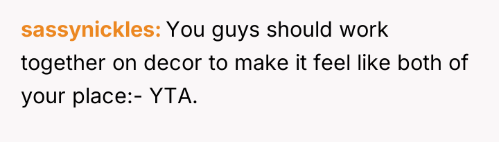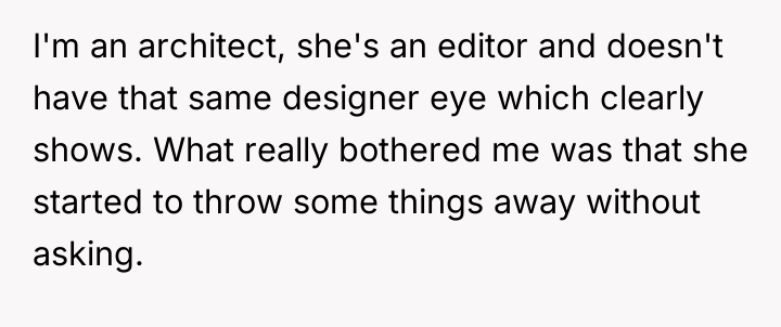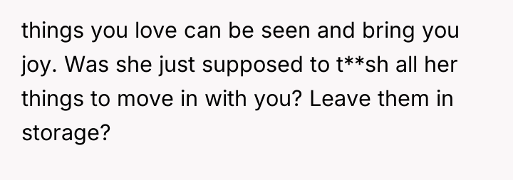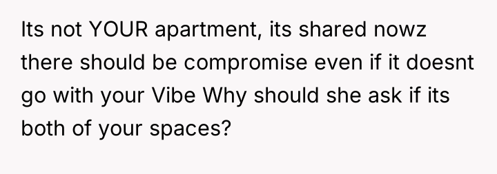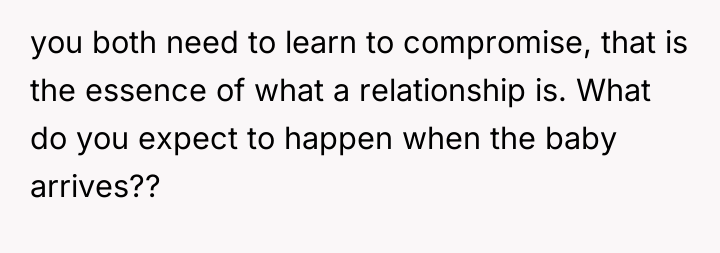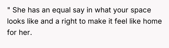 In my opinion, this scenario highlights a common challenge couples face when merging lives and spaces. It’s important to balance personal style with the practical and emotional needs of both partners. Perhaps setting aside some areas for each person’s preferences or blending styles could create a harmonious home that reflects both of their identities. Ultimately, living together, especially during pregnancy, requires patience, understanding, and willingness to adapt as a team.