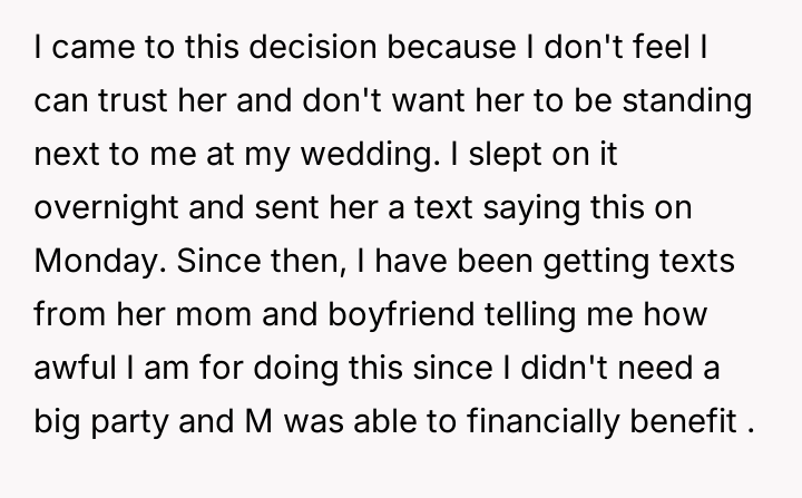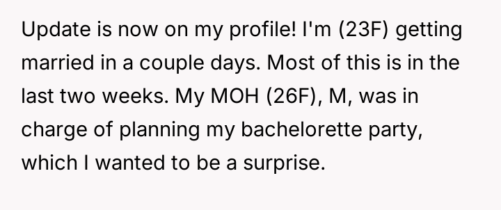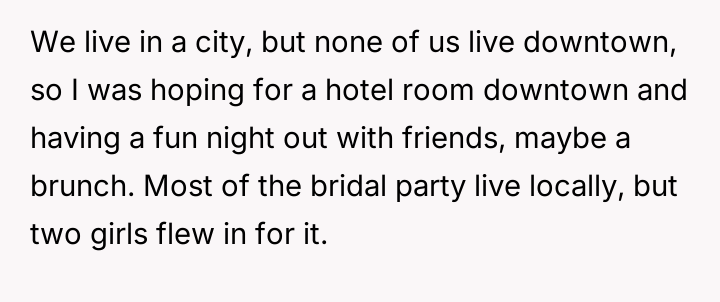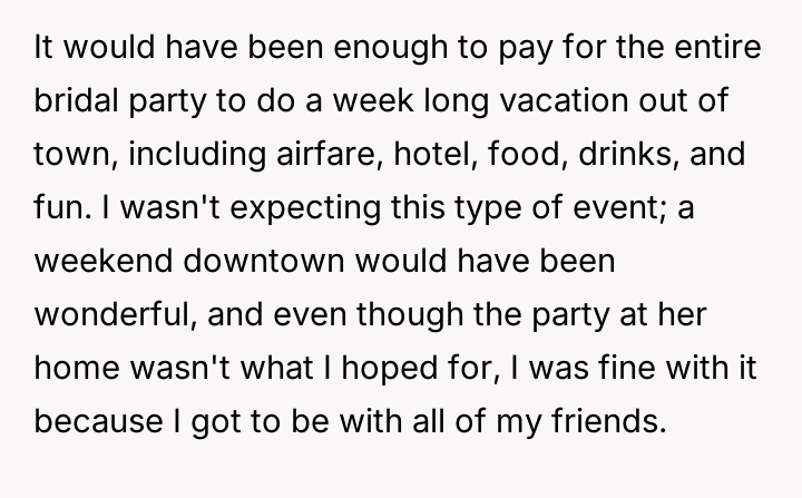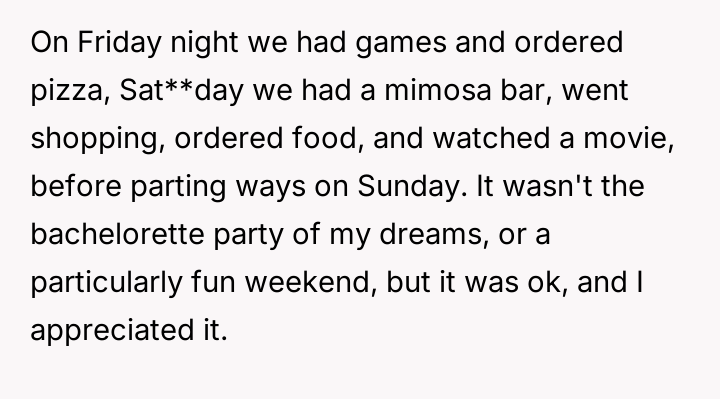 After reading through the Reddit comments, it’s clear that many people sympathize with the bride’s disappointment about her bachelorette party not living up to her expectations. While some commenters felt that the MOH did her best given the circumstances, others suggested that better communication could have helped ensure the bride’s vision was realized. The cramped space and low-key activities didn’t match the bride’s hopes for a lively, downtown celebration, which understandably left her feeling underwhelmed. Yet, the appreciation she showed for the effort and time her friends put into the weekend highlights her graciousness despite the letdown.
