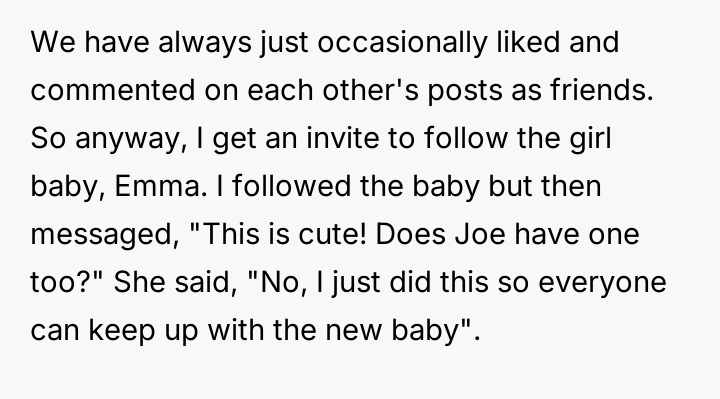 In my opinion, this situation highlights how social media can sometimes distort relationships and communication. What started as a simple curiosity turned into an unexpected personal boundary being enforced in a harsh way. It’s a reminder that people have different comfort levels with sharing their lives online, and sometimes those personal choices aren’t easily understood by others. Ultimately, the best approach might be to respect those boundaries, even when they seem confusing, and maintain connections in more genuine, offline ways.