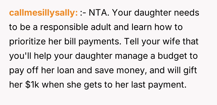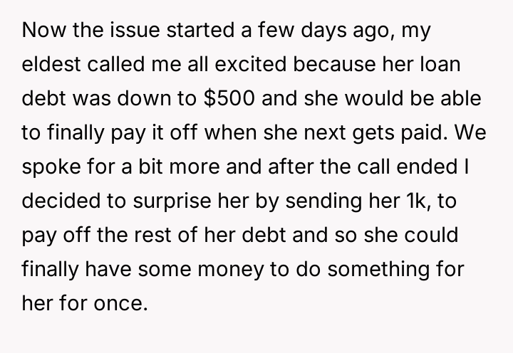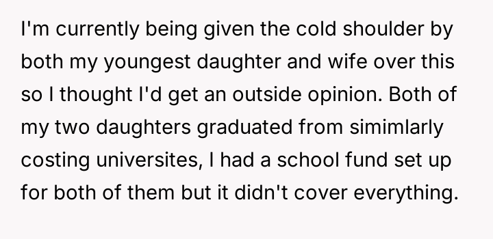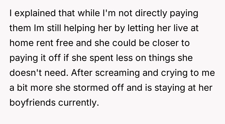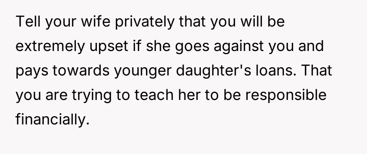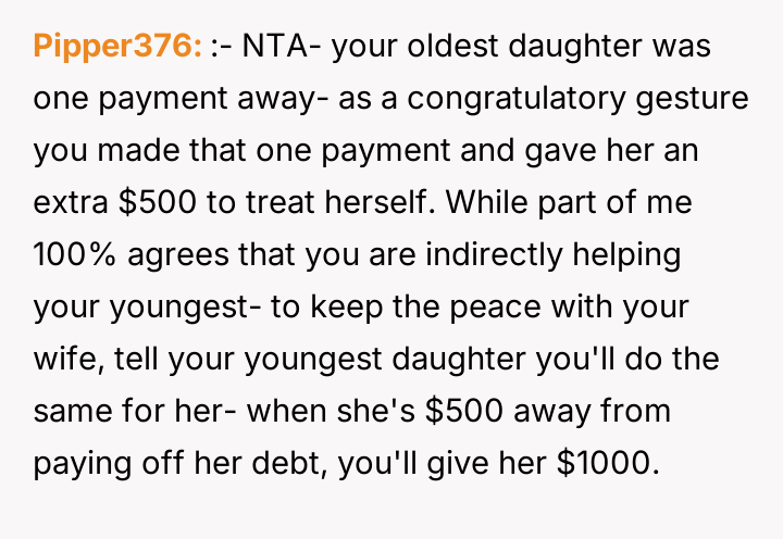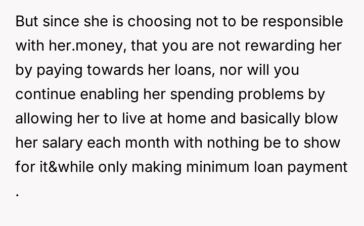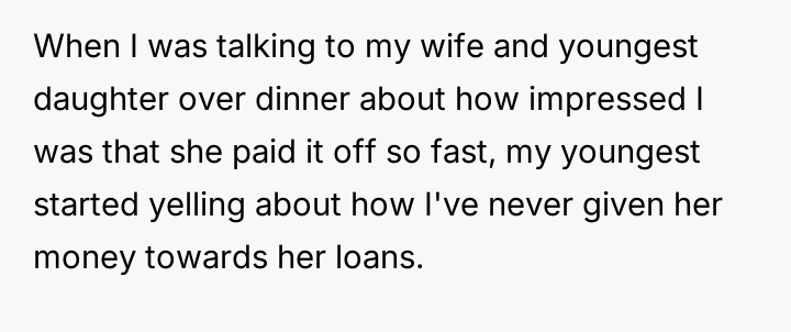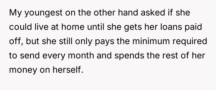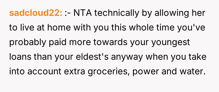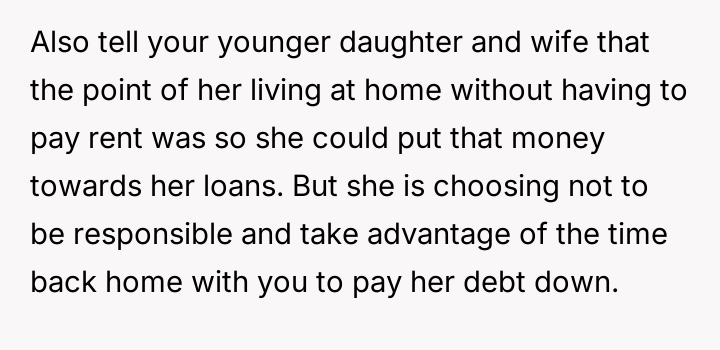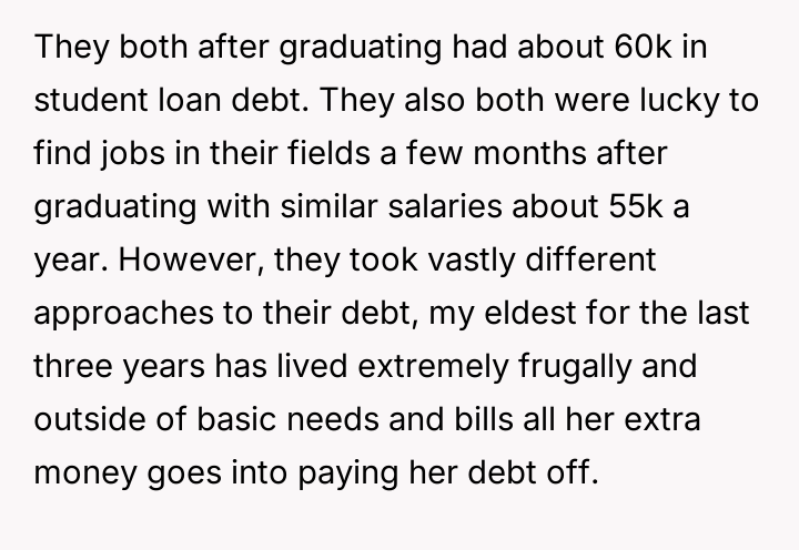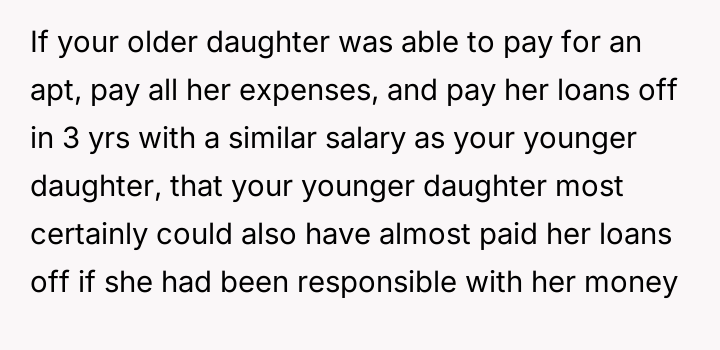Reading through the Reddit comments, it's clear that many people sympathize with the eldest daughter's diligence and sacrifice in aggressively paying off her student loans. Commenters appreciate her commitment and recognize the financial burden she’s tackling head-on, often praising her responsible attitude. On the other hand, opinions about the youngest daughter are mixed—some feel it's reasonable for her to live at home and take her time paying off the loans, while others criticize her spending habits as irresponsible, especially given the opportunity to minimize expenses by living rent-free.