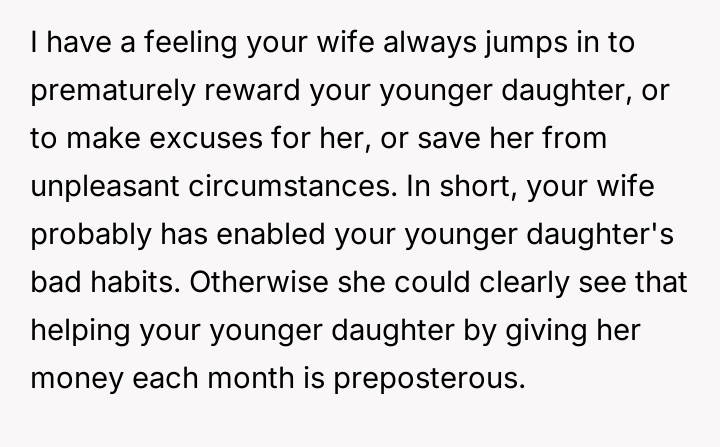 In my opinion, this situation highlights the delicate balance between financial responsibility and family dynamics. While the eldest daughter's approach is commendable for its discipline, it’s important to acknowledge that everyone has different circumstances and coping mechanisms. The cold shoulder from the wife and youngest daughter suggests underlying emotional tensions that money alone can’t resolve. Open communication about expectations and empathy for each other's choices might help repair relationships and foster mutual understanding.