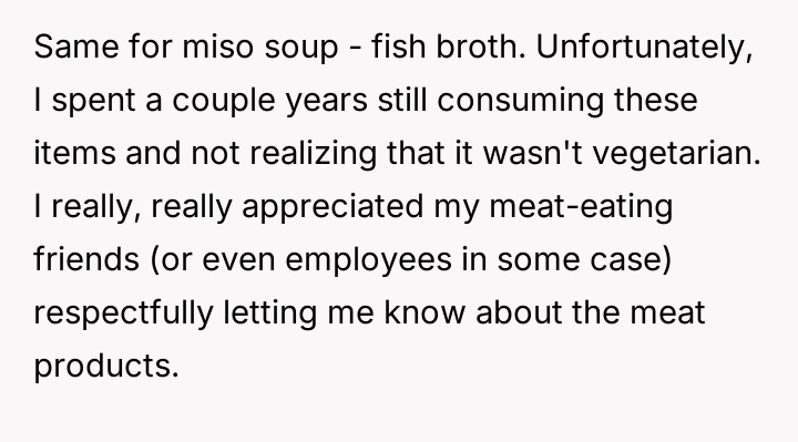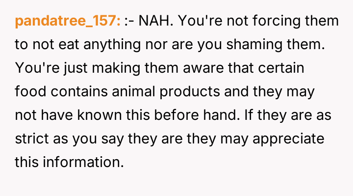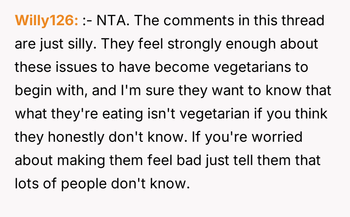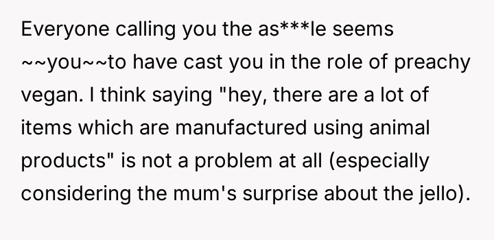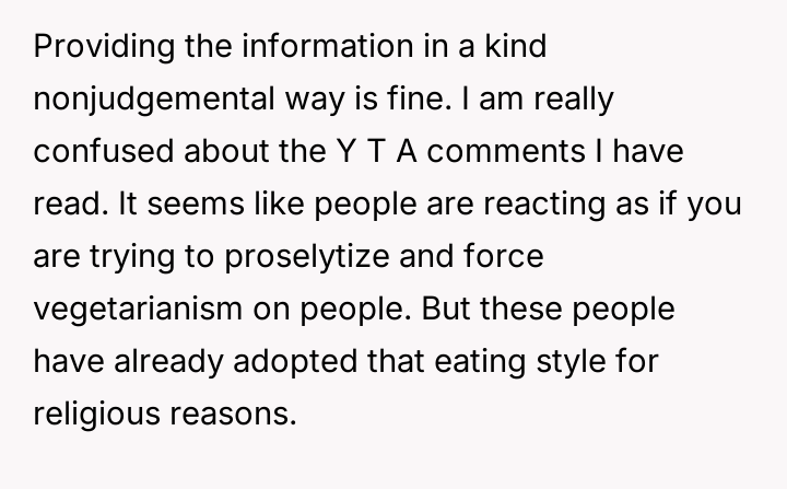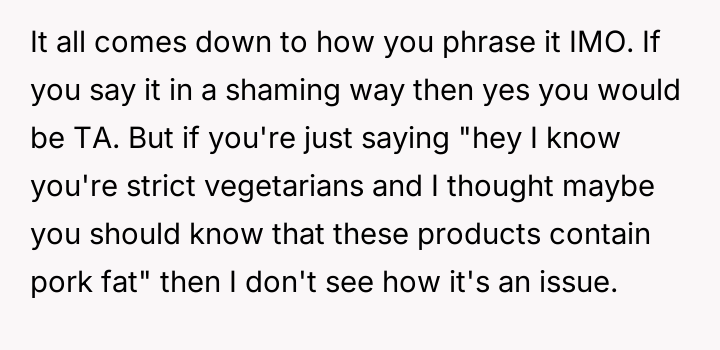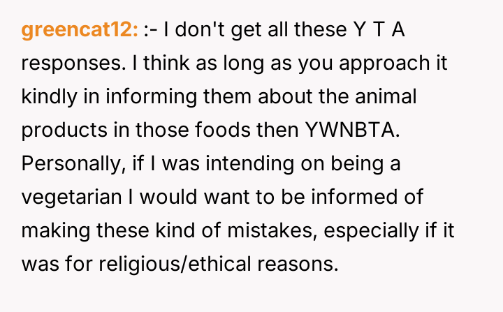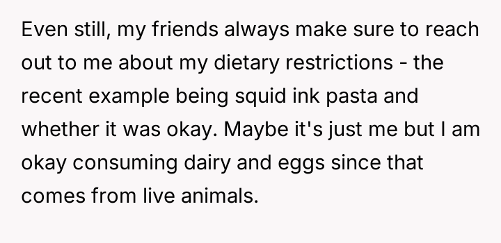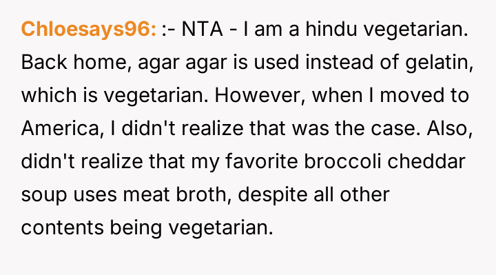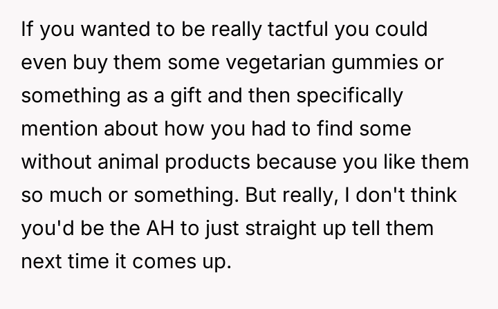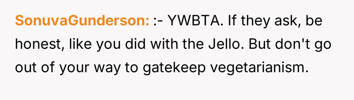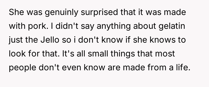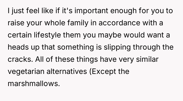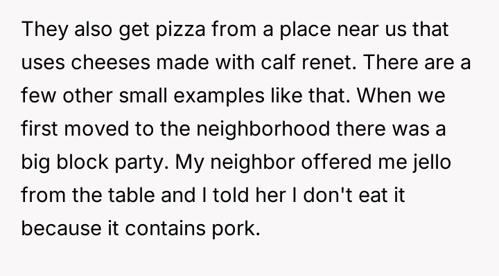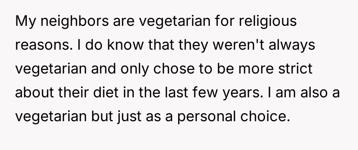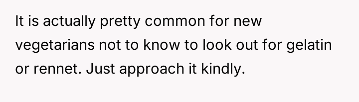 After reading through the Reddit comments, it's clear that many readers sympathize with the nuanced challenges of navigating dietary restrictions within close-knit communities. Some pointed out that the neighbors’ religious vegetarianism might focus more on the avoidance of meat itself rather than all animal-derived ingredients, which could explain the occasional oversight with gelatin or rennet. Others suggested that these small lapses are common and often unintentional, highlighting the importance of open communication to avoid misunderstandings.