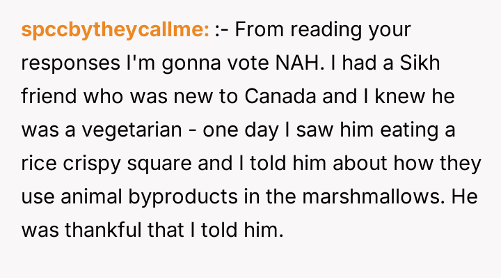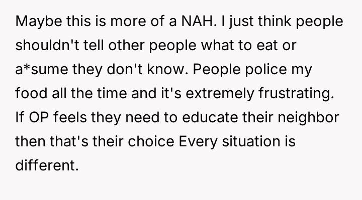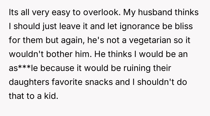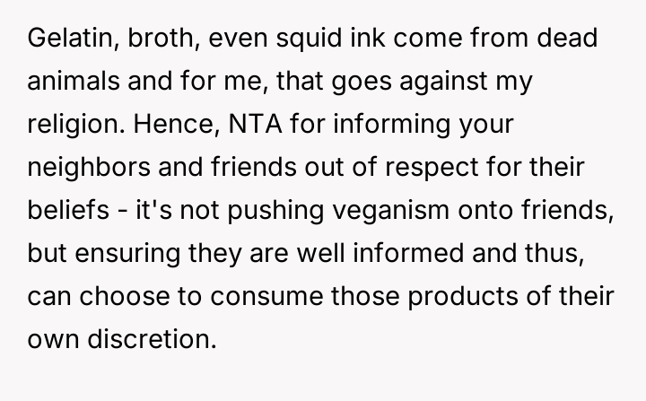 In my opinion, this story underscores how complex and personal dietary choices can be, especially when intertwined with cultural or religious beliefs. While it's understandable that the poster feels uneasy about their daughter consuming animal-derived products unknowingly, fostering a respectful dialogue with neighbors about these differences could lead to greater awareness and mutual respect. After all, the goal is to support each other's values while maintaining the warmth and friendship that make a neighborhood feel like home.