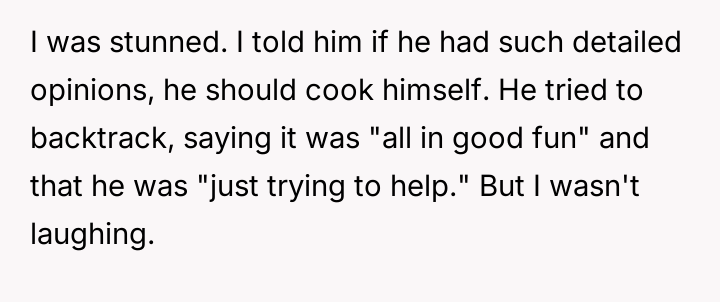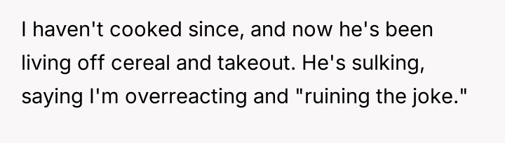 The OP's immediate reaction—stopping cooking entirely—is a clear boundary enforcement mechanism. It is a direct, albeit reactive, response to feeling devalued. The boyfriend's subsequent sulking and accusation that she is 'ruining the joke' reveals a lack of accountability and an inability to accept responsibility for the emotional impact of his actions. He is prioritizing his perceived right to joke over his partner's demonstrated distress.