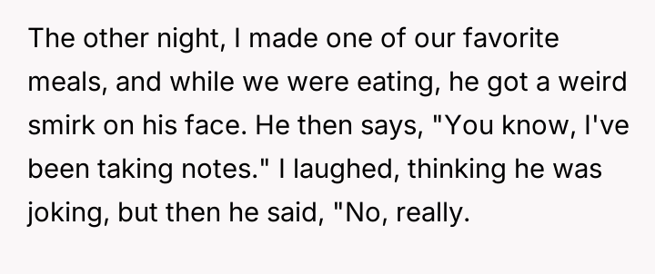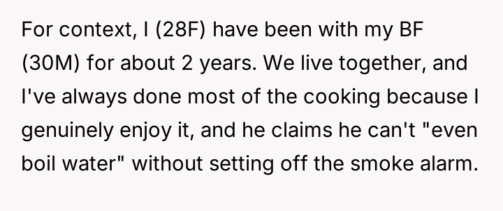 The story involves a 28-year-old woman (OP) and her 30-year-old boyfriend of two years, with whom she lives. The OP has traditionally handled most of the cooking because she enjoys it. The conflict began after a shared dinner when the boyfriend revealed he had prepared a detailed presentation critiquing her culinary efforts.