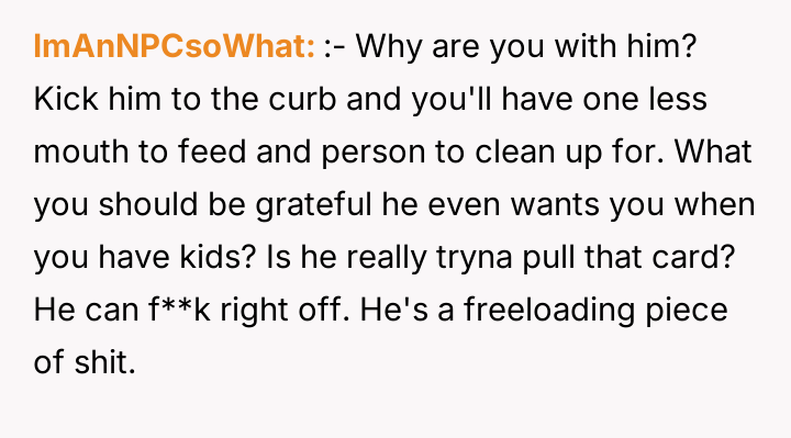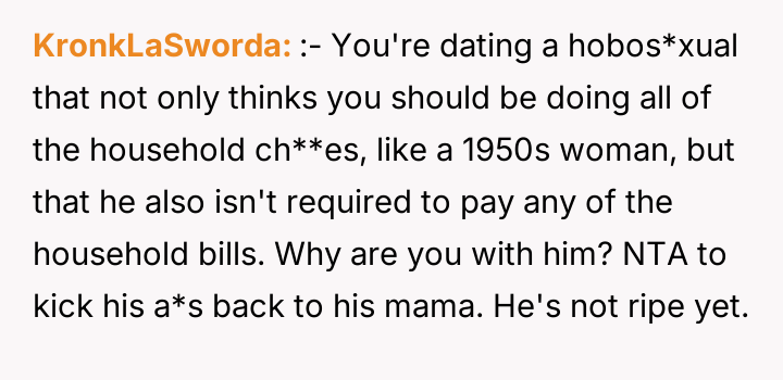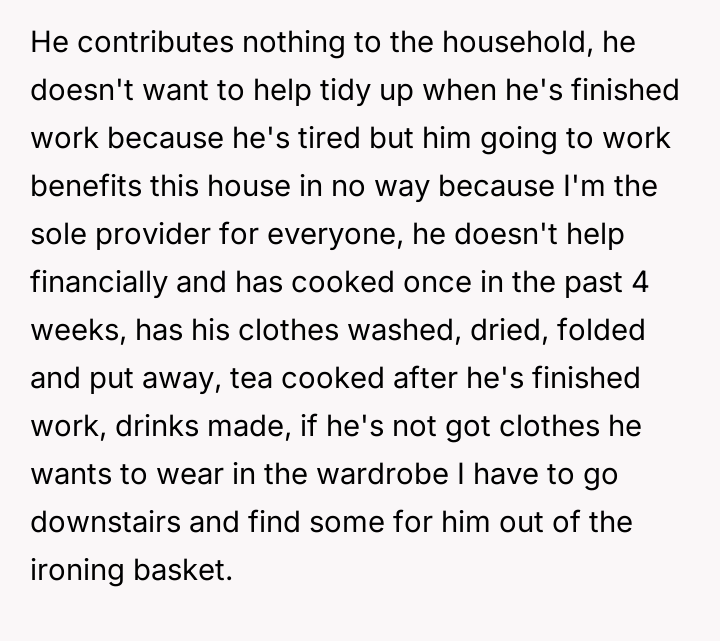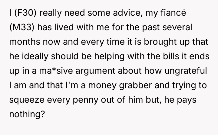 The fiancé reacted very negatively to this request, accusing the OP of being ungrateful and attempting to exploit him financially, despite paying nothing toward household expenses. He argues that his current level of contribution is sufficient, which is causing the OP significant distress regarding financial support and shared responsibility. The central question is whether the OP is wrong to expect her cohabiting fiancé to contribute financially to the home where he lives full-time.