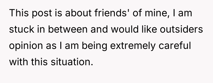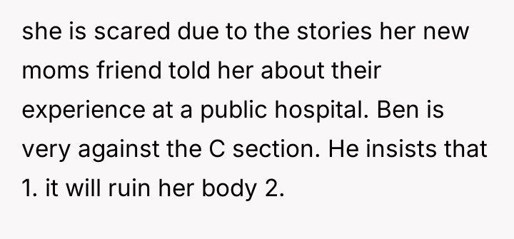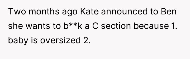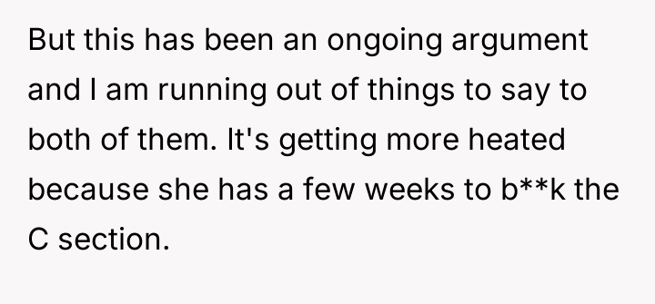 Ben strongly opposes the scheduled C-section, arguing that it will negatively affect Kate's body, prevent future natural births, and that recovery from surgery is more difficult than natural labor. As the discussion becomes more heated with the b**king deadline approaching, the OP finds themselves stuck in the middle, struggling to support either friend. The central question is how to navigate this intense disagreement between two people they care about deeply.