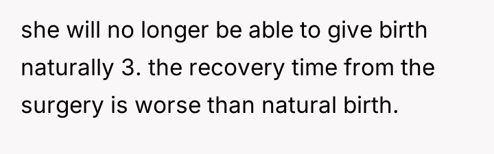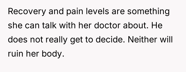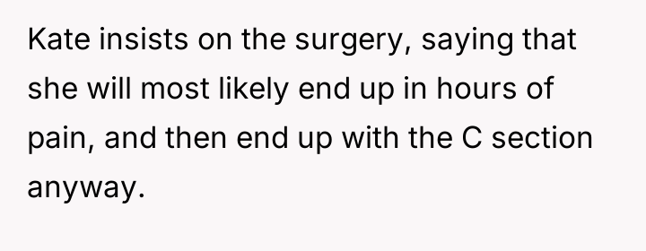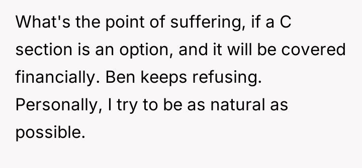 The OP is currently in a difficult position, acting as an unwilling mediator between Kate, who is prioritizing her perceived comfort and safety via a scheduled procedure, and Ben, who is focused on the potential long-term physical implications of surgery over natural birth. This conflict highlights a fundamental disagreement over bodily autonomy and medical choice versus traditional expectations of childbirth.