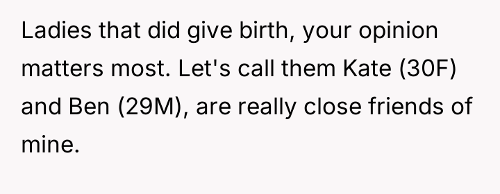 The situation involves two close friends, Kate (30F) and Ben (29M), who are expecting their first child in one month. The core conflict centers on Kate's decision to schedule a Cesarean section (C-section). Kate desires the planned surgery due to concerns about the baby's size, her mother offering to cover the private hospital costs, and her fear stemming from negative stories about public hospital births.
