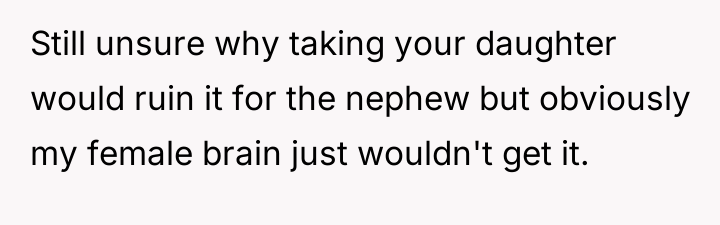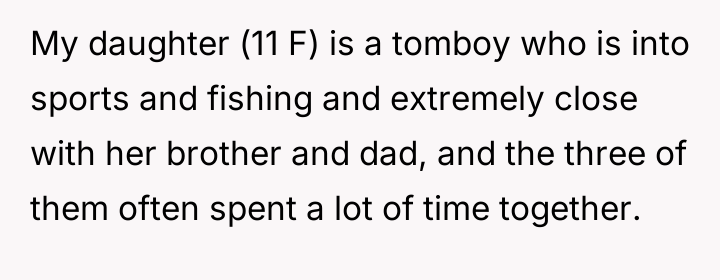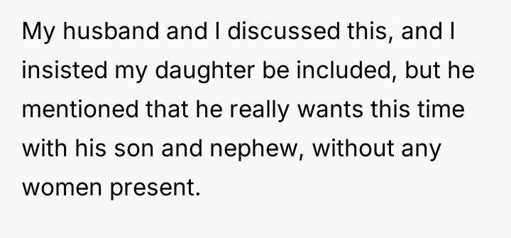 The core issue revolves around a planned summer trip organized by the husband, intended as a "guys only" vacation involving his son (13M) and nephew (12M). The OP's daughter (11F), who is very close to her father and brother, enjoys similar activities like sports and fishing, and was excluded from this trip by the husband's request for time without women present.