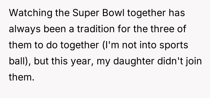 The husband established a boundary—a 'guys only' trip—that directly conflicted with the established close bond he shared with his daughter. While parents are entitled to schedule one-on-one time, the manner in which this was enforced, overriding the daughter's known interests and relationship with him, has understandably triggered a reaction of withdrawal. The daughter's behaviors—avoiding shared activities like watching the Super Bowl and actively seeking the mother's presence over the father's—are classic indicators of a boundary violation perceived as rejection.