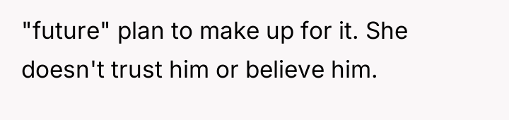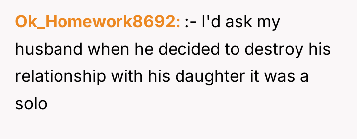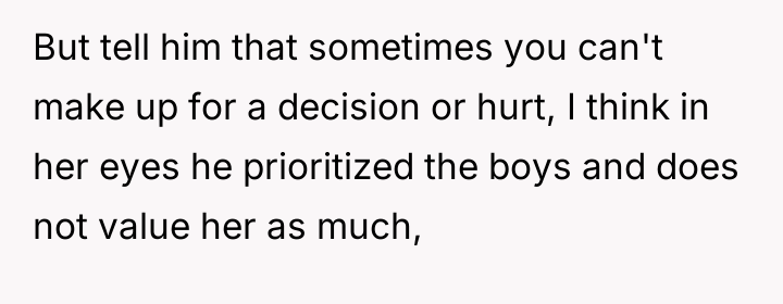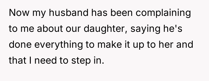 The husband's current stance, demanding the OP 'step in' as part of a 'team' effort, suggests a misunderstanding of accountability. While teamwork is vital in parenting, the initial cause of the rift belongs to the decision-maker. The OP is correct that the husband must lead the repair effort, as he is the one who needs to validate the daughter's feelings about being excluded. A constructive path forward involves the husband focusing less on 'cheering her up' with new activities and more on sincerely acknowledging the pain caused by the exclusion itself, thereby rebuilding trust before attempting to schedule future bonding.
