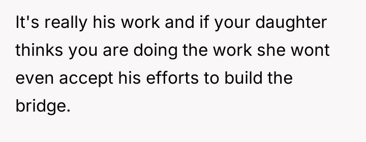 The debate centers on whether a parent who initiates an action causing emotional distress must solely manage the repair, or if the co-parent has a duty to assist in conflict resolution regardless of who caused the initial offense. Readers must consider where the primary responsibility for mending the father-daughter relationship lies in this scenario.