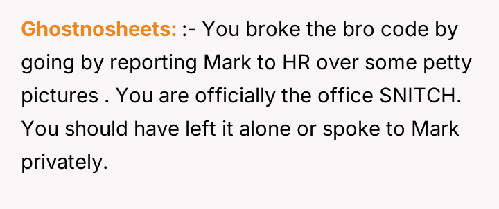 The core issue revolves around balancing the obligation to report unprofessional behavior against the desire to maintain positive working relationships. The debate centers on whether OP should have addressed Mark privately or remained silent to avoid workplace tension, or if adhering to professional conduct standards, regardless of the outcome, was the only appropriate course of action.