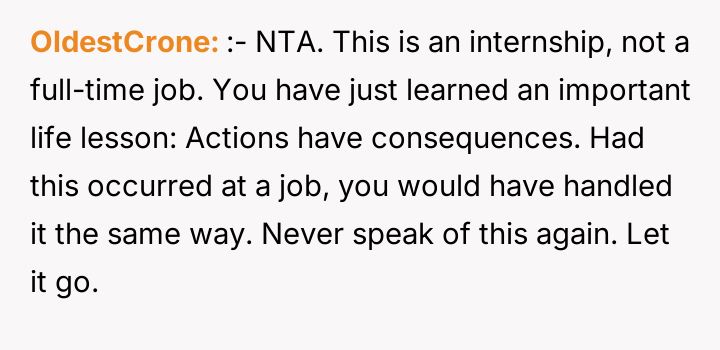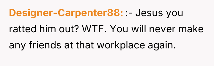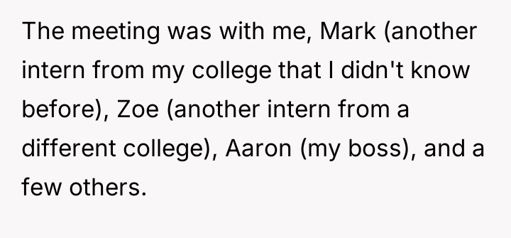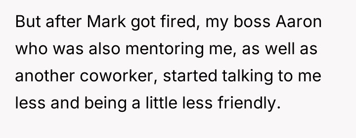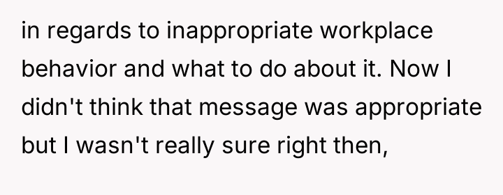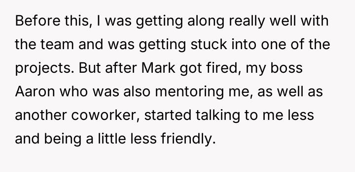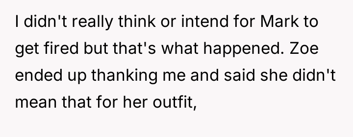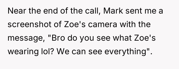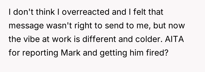 Towards the end of the call, fellow intern Mark sent OP a screenshot of Zoe's camera with a message mocking her outfit. OP, recognizing this message as potentially inappropriate workplace conduct, decided to report Mark's communication to HR. This action resulted in Mark being fired, leading to a noticeable shift in the office atmosphere, with the boss and other coworkers becoming distant and less friendly towards OP. The central dilemma for OP is whether reporting Mark was the correct action, given the negative professional fallout.
