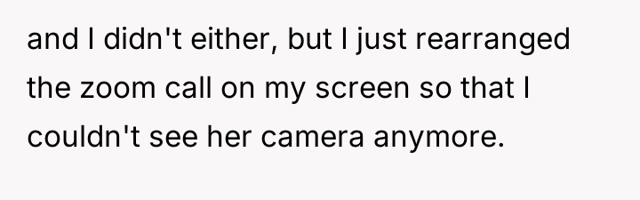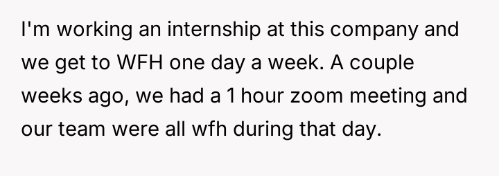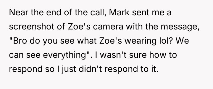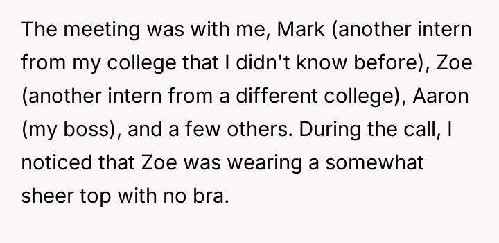 The original poster (OP) was participating in a one-hour work-from-home Zoom meeting with their team, including fellow interns Mark and Zoe, and their boss, Aaron. During this meeting, OP noticed that Zoe was wearing revealing attire. OP did not comment on the situation at the time but adjusted their screen view to avoid seeing her camera.