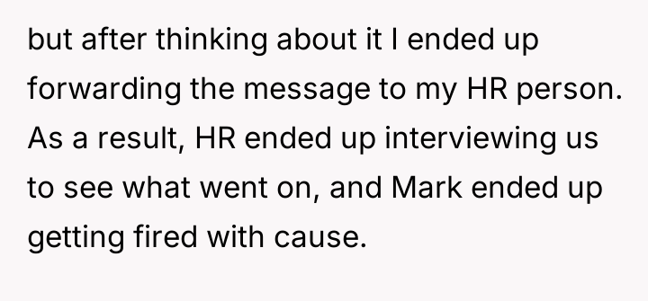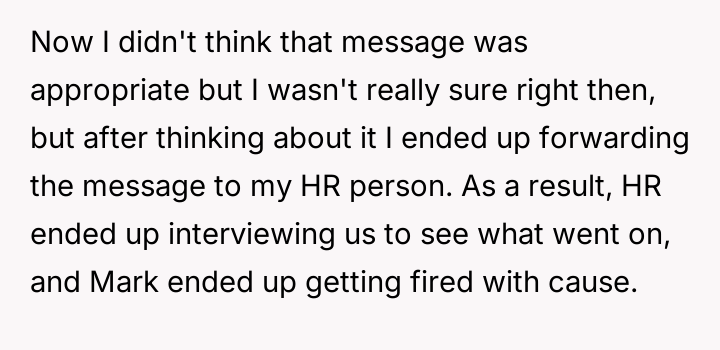 The OP was faced with a choice between intervening in what appeared to be harassment or inappropriate commentary (Mark's message) and maintaining social comfort within the intern group. Mark's action of taking and sending a screenshot of a colleague's image without consent, especially in a professional setting, crosses a significant boundary. OP's decision to report this to HR aligns with standard corporate guidelines regarding inappropriate conduct and cyber-bullying, regardless of intent. HR's decision to terminate Mark suggests the offense was deemed severe enough to warrant immediate separation, likely due to existing workplace conduct policies.