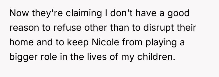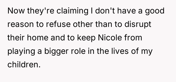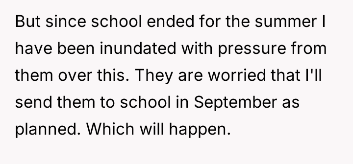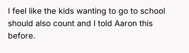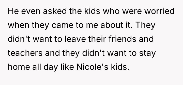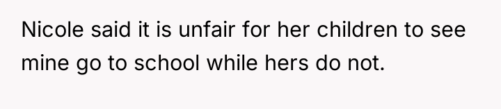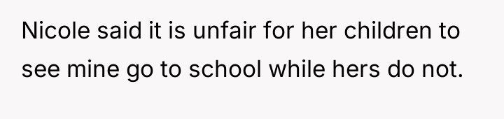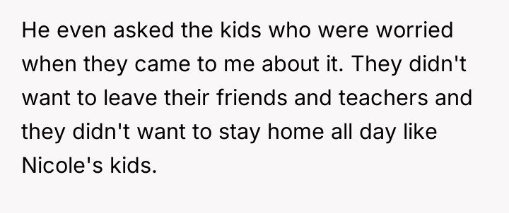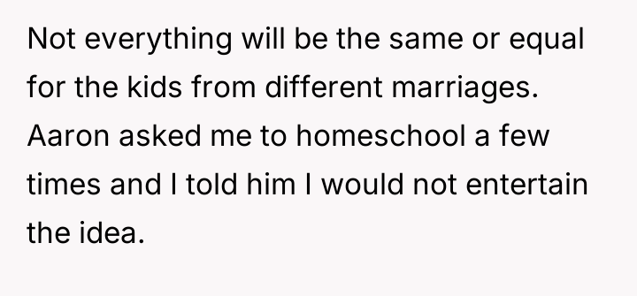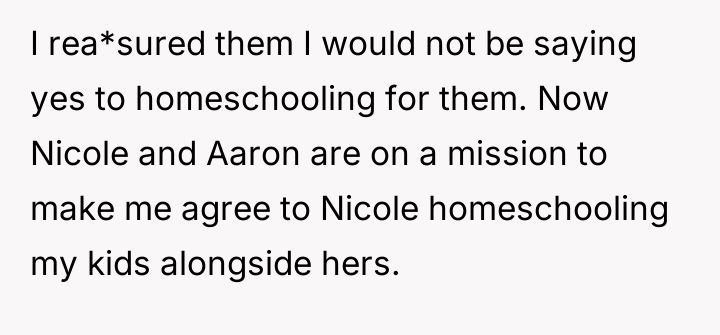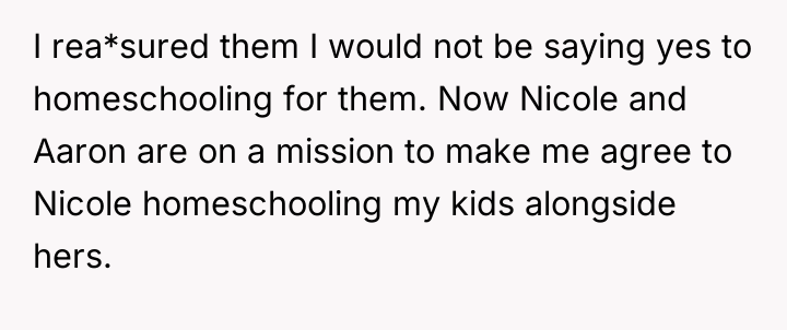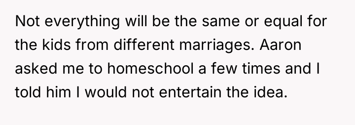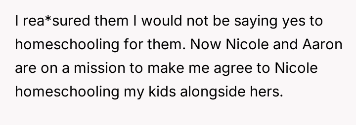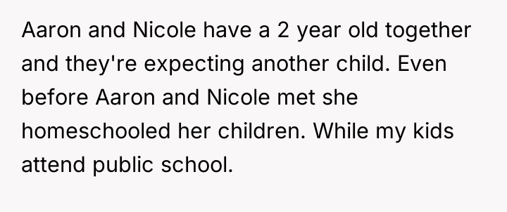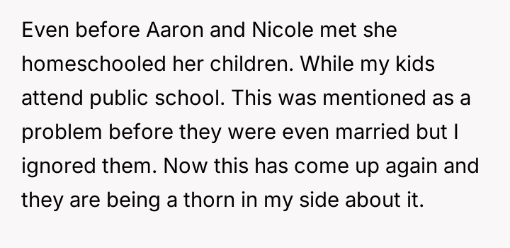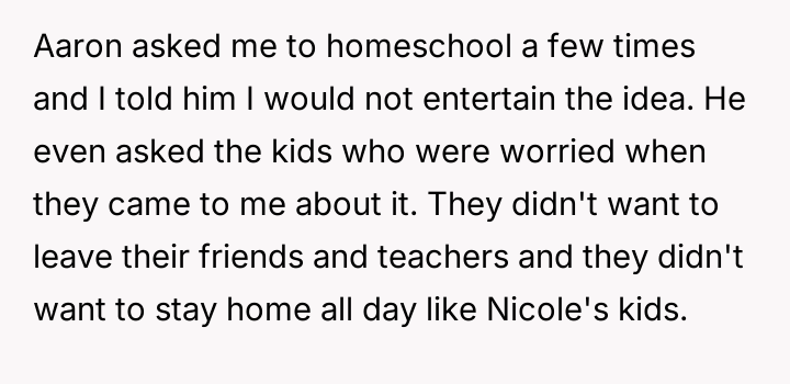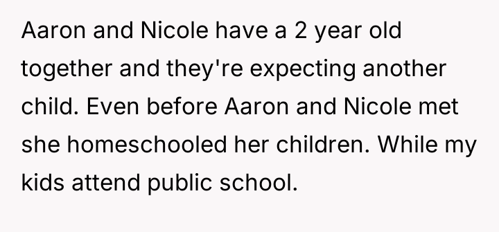 Nicole insists that the OP's children should leave public school and join her homeschooling program, citing jealousy among her own children and a desire for family uniformity. The OP has firmly refused this request, which has escalated into ongoing pressure from both Aaron and Nicole, leading the OP to question if her refusal is solely intended to cause disruption. The central question is whether the OP is justified in maintaining her children's current public school enrollment against the wishes of her ex-husband and his new partner.