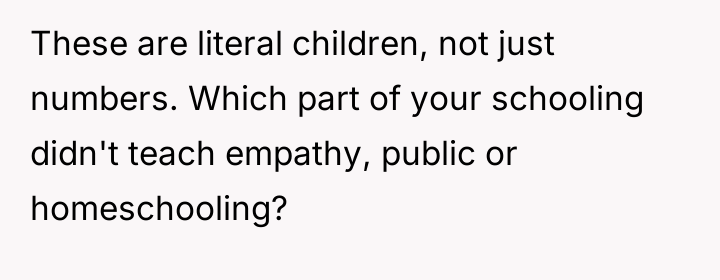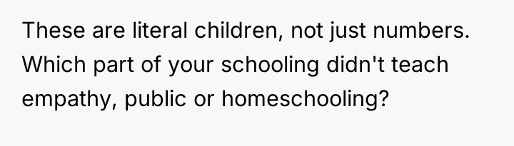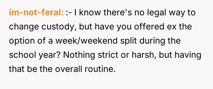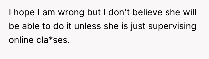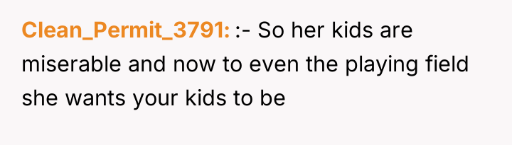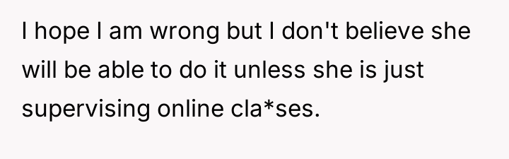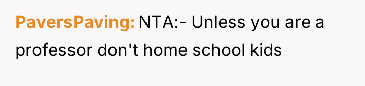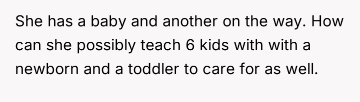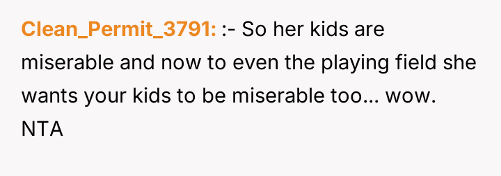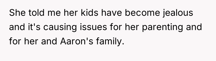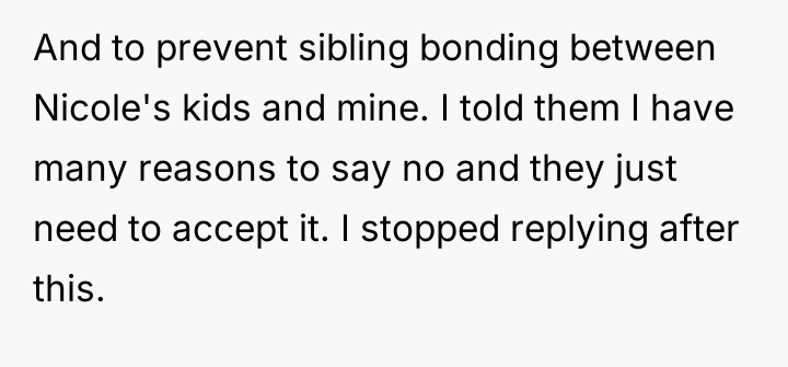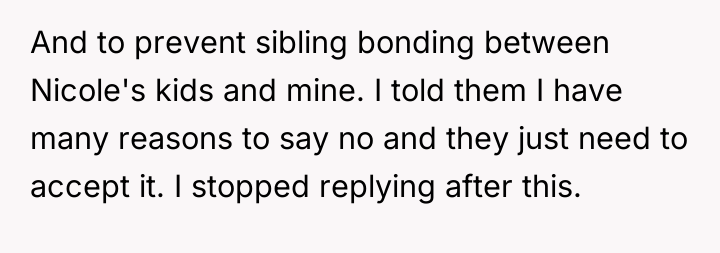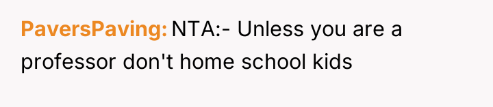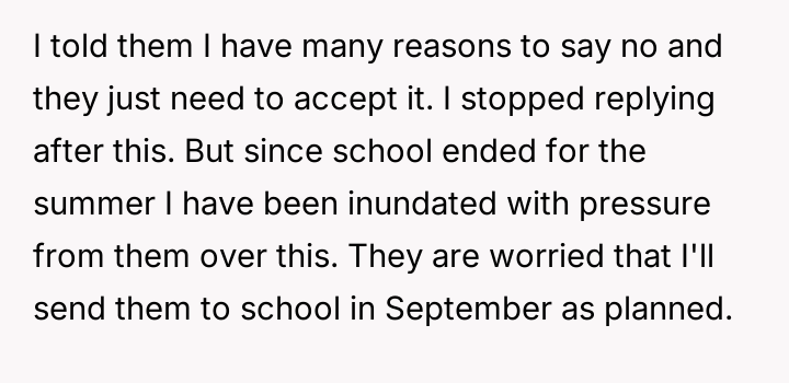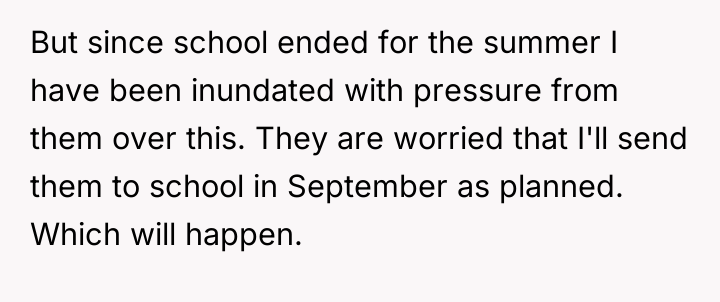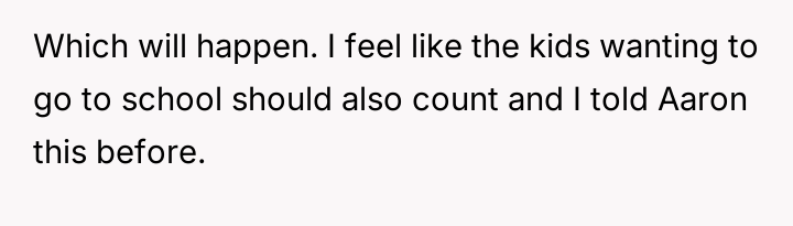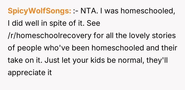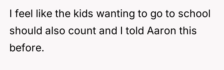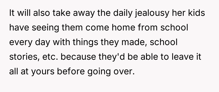 Nicole insists that the OP's children should leave public school and join her homeschooling program, citing jealousy among her own children and a desire for family uniformity. The OP has firmly refused this request, which has escalated into ongoing pressure from both Aaron and Nicole, leading the OP to question if her refusal is solely intended to cause disruption. The central question is whether the OP is justified in maintaining her children's current public school enrollment against the wishes of her ex-husband and his new partner.