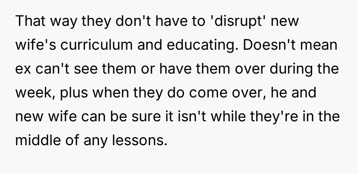 The situation presented highlights a common boundary conflict in post-divorce arrangements. The OP has established a stable, preferred environment (public school) for her children, which they actively support. Aaron and Nicole, however, appear to be attempting to impose their chosen lifestyle—homeschooling—onto the OP’s children. Their arguments regarding jealousy or family bonding, while emotionally relevant to their household, do not supersede the OP's right and responsibility to make educational decisions for her children, especially when those children express a clear desire to stay in school.