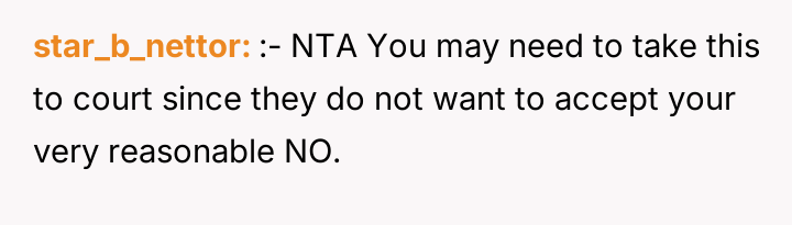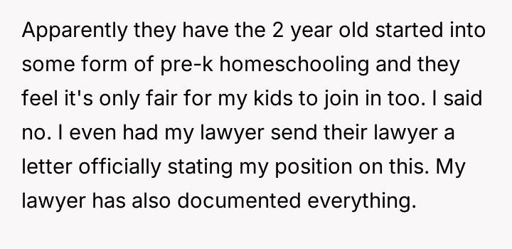 The intensity of the pressure, including involving lawyers, suggests that Aaron and Nicole are struggling with accepting the inherent differences in a blended family structure. The OP's consistent 'no' and documentation are appropriate boundary enforcement mechanisms. A professional recommendation would be for the OP to continue minimizing contact regarding this specific topic, referring all future educational inquiries to legal channels, thereby protecting the children from the ongoing negotiation.