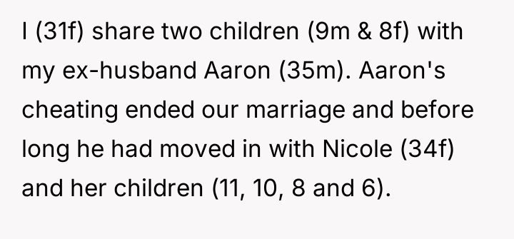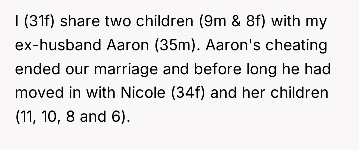 The original poster (OP), a 31-year-old woman, shares two children with her ex-husband, Aaron (35m), following a divorce caused by his infidelity. Aaron is now cohabiting with Nicole (34f) and her existing children, and they share two younger children together. A conflict has arisen regarding the educational setting for the OP's children (9m and 8f).