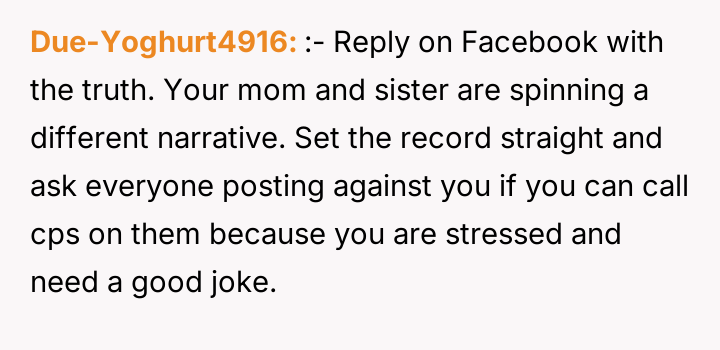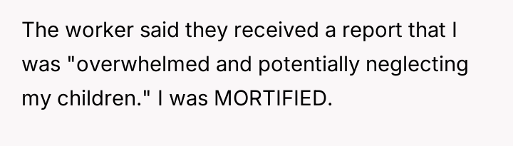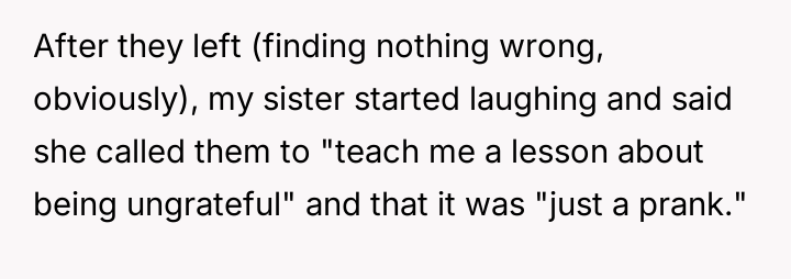 Conflict arose when the OP became upset after finding her toddler had caused a large mess while the sister was supposed to be supervising. This led to an argument where the OP demanded the sister leave if she could not help more. Shortly after, the sister reported the OP to Child Protective Services (CPS), claiming the OP was overwhelmed and neglecting the children. The OP discovered the report was a deliberate act by her sister intended as a 'prank' and immediately demanded she vacate the premises. Now, with her husband supporting her decision but the rest of her family furious, the OP questions if she was too harsh in kicking her sister out.