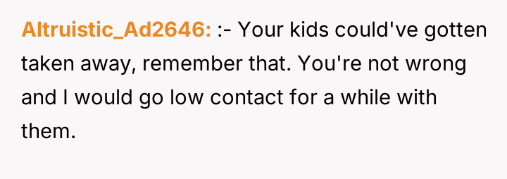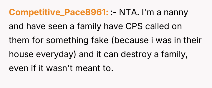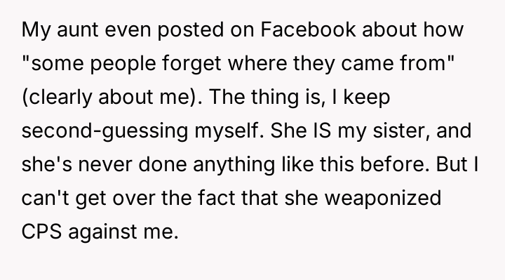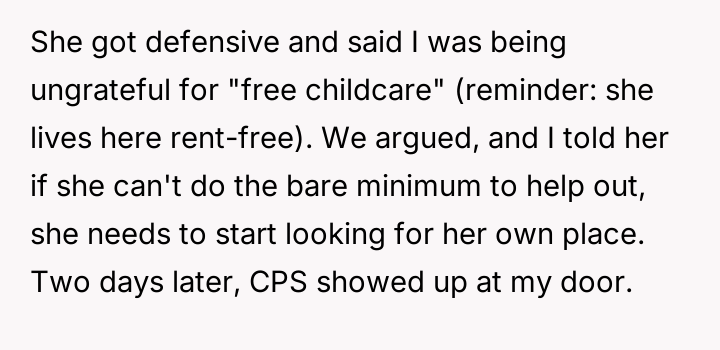 The sister’s action of calling CPS is not a simple argument or a childish prank; it is a profound violation of boundaries and safety. Weaponizing a system designed to protect vulnerable children demonstrates a severe lack of judgment and empathy toward the OP, who was already managing the stress of having two small children and an unexpected houseguest. The OP's motivation for immediate removal stems from a legitimate fear regarding the potential legal and emotional consequences that such a report, even if false, could have inflicted upon her family unit.