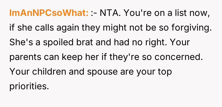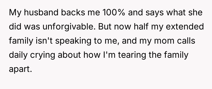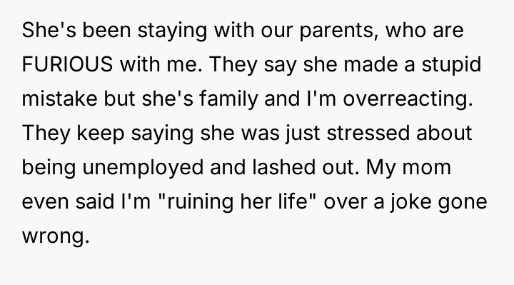 The OP is currently facing significant emotional backlash from her extended family, who view her reaction as an overreaction to a foolish mistake made by her sister under stress. The core conflict centers on the OP's need to establish firm boundaries against a severe breach of trust versus the family expectation that she should forgive a severe transgression because of their blood relationship.