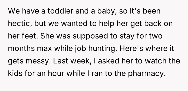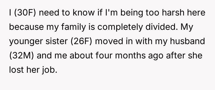 The Original Poster (OP), a 30-year-old woman, allowed her 26-year-old younger sister to move into her home with her husband and two young children after the sister lost her job. The initial arrangement was temporary, set for a maximum of two months to allow the sister time to find new employment while living rent-free.