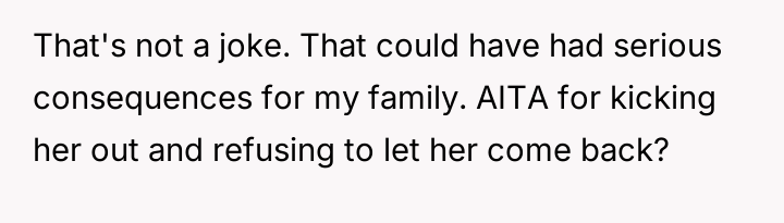 The central question remains whether the weaponization of a state agency like CPS, regardless of the sister's stated intent as a 'prank,' justifies an immediate and permanent exclusion from the home. Readers must weigh the severity of the action against the context of family support and potential for reconciliation.