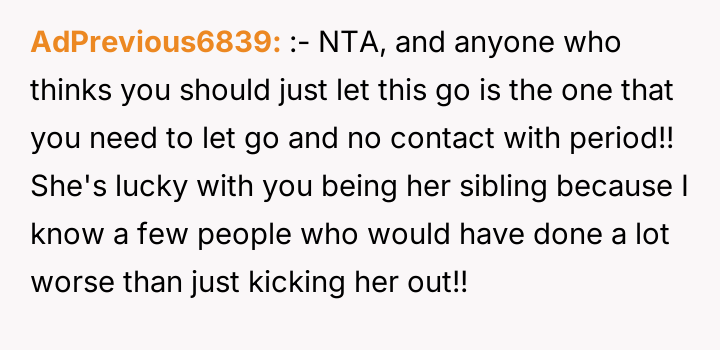 While family pressure suggests the OP should be more lenient due to the sister being unemployed and stressed, this excuse does not mitigate the action taken. Setting a firm boundary by enforcing the immediate eviction was a necessary act of self-preservation for the OP's household security. Moving forward, the OP must maintain her boundary regarding the immediate threat but should consider allowing an intermediary, such as her supportive husband, to facilitate a structured, low-contact conversation with the sister later, focusing only on acknowledging the harm done, rather than immediately discussing her return.