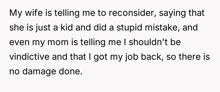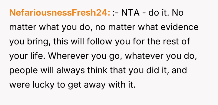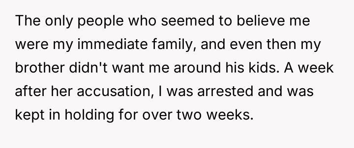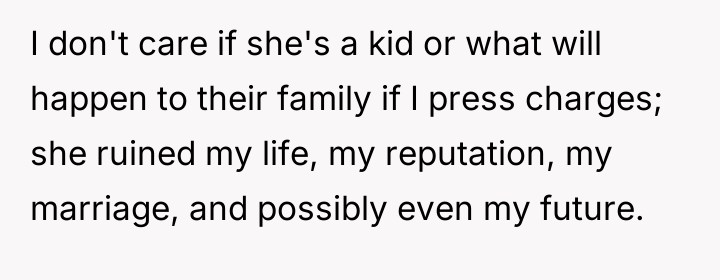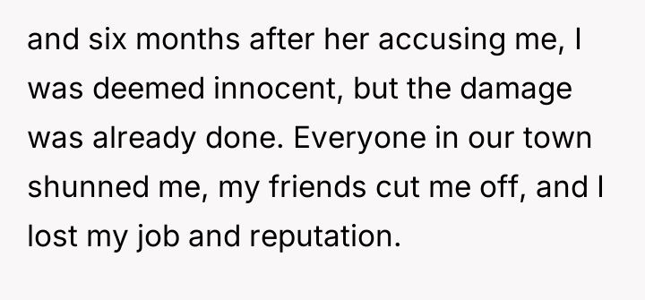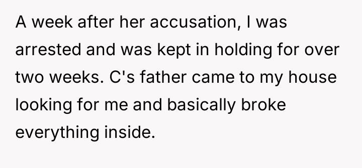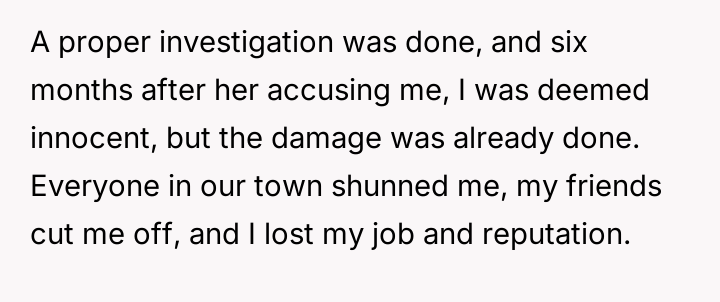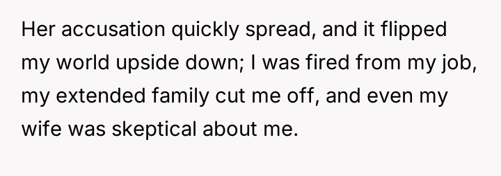 The immediate consequence was severe: the OP lost his job, was cut off by extended family, and faced skepticism from his wife, leading to an arrest and two weeks in holding. After a six-month investigation cleared him, the damage to his reputation and social standing remained. Now, facing the aftermath, the OP is torn between pursuing legal action against C and her family for defamation and property destruction, and listening to his wife and mother, who urge him to drop the charges because C is just a child. The central dilemma is whether to seek accountability for the life-altering consequences he endured or show leniency due to the accuser's age.