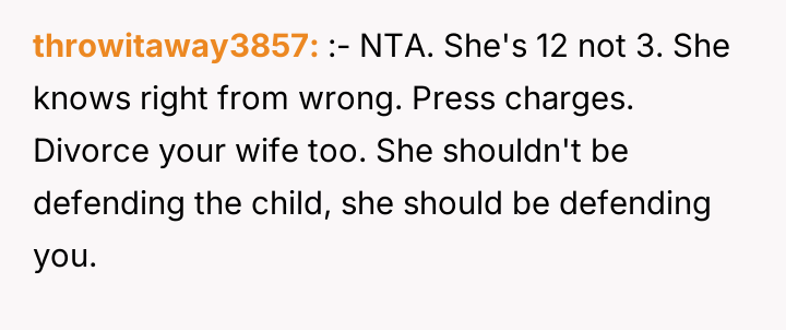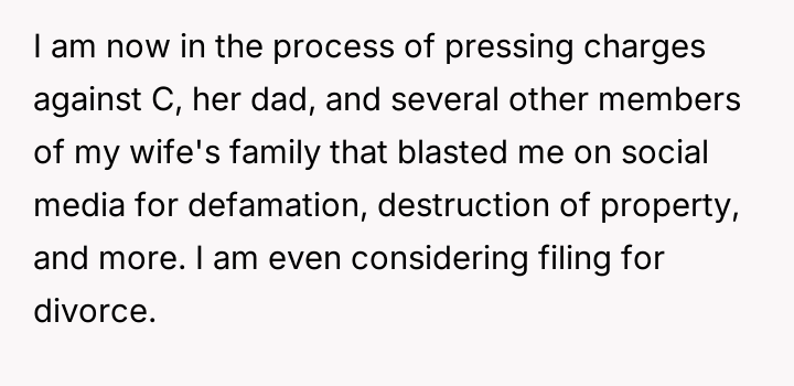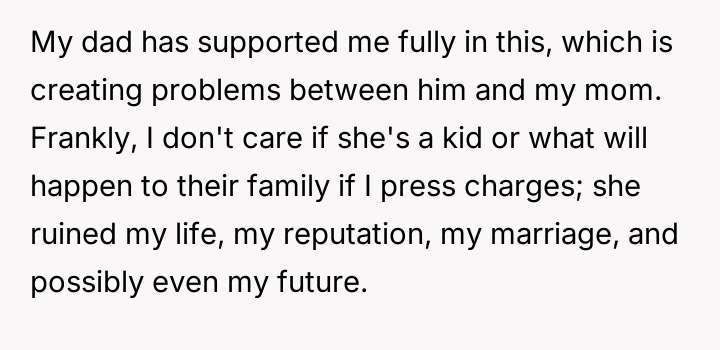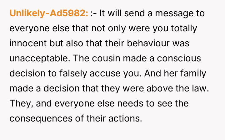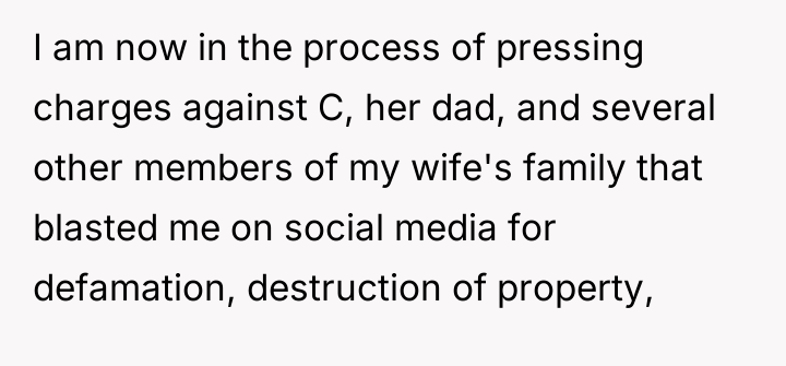 The pressure from the OP's mother and wife to drop the charges complicates the situation by layering emotional labor onto his trauma. It suggests that maintaining family peace and protecting a child (C) is prioritized over acknowledging the severe injustice done to the OP. The father's support offers a crucial counter-balance, recognizing the validity of the OP's legal standing. A professional recommendation would be for the OP to continue pursuing the civil aspects of his case (defamation/destruction of property) to legally establish the truth and seek financial redress, while perhaps exercising discretion on criminal charges against the minor. This path allows for accountability without completely destroying the cousin's future, though the OP must accept that his marriage may need significant repair regardless of the outcome.