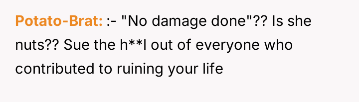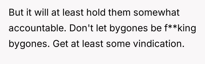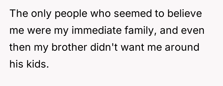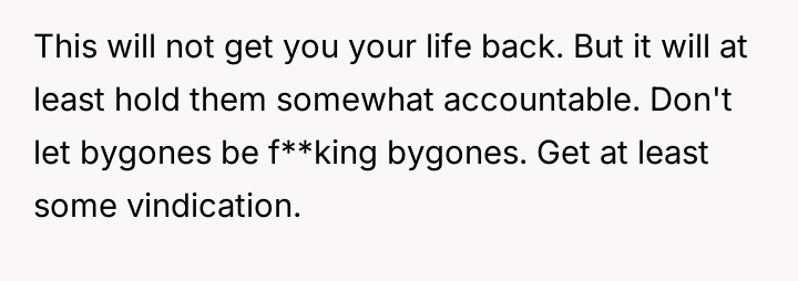 The OP's situation presents a clash between restorative justice (focusing on the well-being of the young accuser and the family unit) and retributive justice (seeking punishment for the harm caused). The OP was subjected to extreme collateral damage—job loss, social ostracization, and incarceration—based on the accusation, even though he was later found innocent. While the 12-year-old cousin may have acted impulsively or been influenced by others, the legal system’s declaration of innocence does not erase the real-world devastation experienced by the OP. His desire to press charges for defamation and destruction of property speaks to a fundamental need for validation and the restoration of his reputation, which are essential elements of psychological recovery.