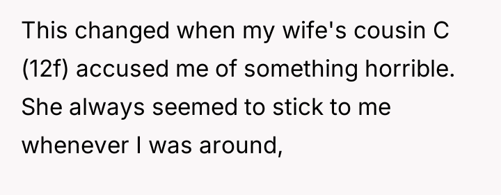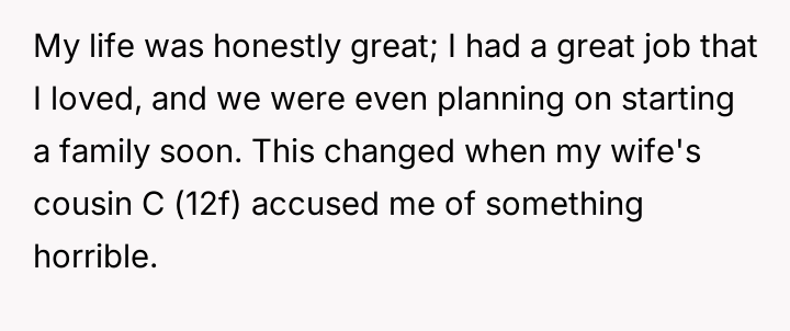 The OP (25m) had a stable and positive life, including a job he enjoyed and plans to start a family with his wife (24f). This stability was shattered when his wife's 12-year-old female cousin (C) made a serious accusation against him.