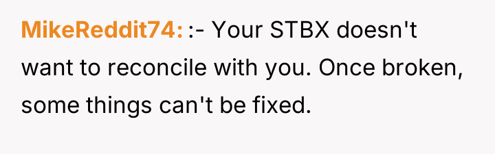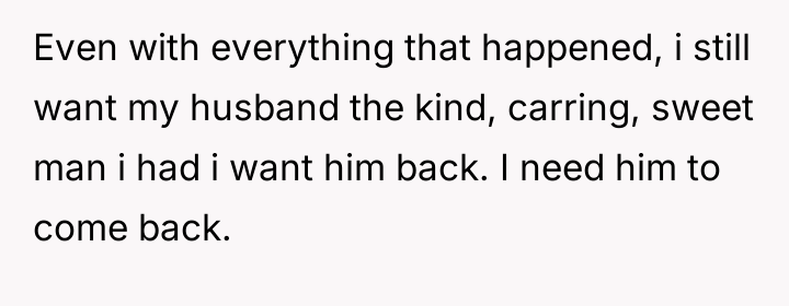 The core conflict is the OP's intense desire to reconcile with the man she remembers versus the reality of the man who has clearly ended the relationship due to perceived disrespect from her and her family. The central question for consideration is whether the OP should focus on immediate survival and establishing boundaries, or if continuing efforts to repair the marriage, despite the husband's definitive actions and restraining orders, is a worthwhile pursuit.