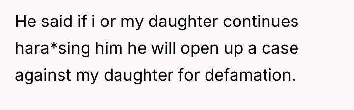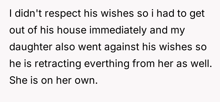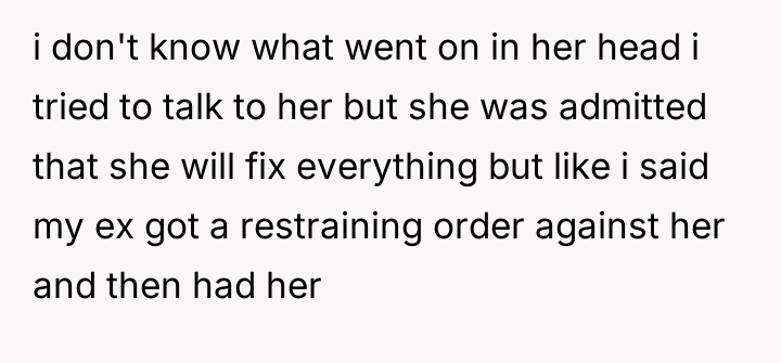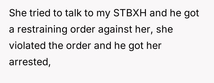 The daughter's situation adds a layer of secondary trauma and legal risk. Her attempt to mediate resulted in her being legally barred and arrested, indicating the high-stakes environment created by the conflict. For the OP, the professional recommendation must shift entirely toward self-preservation. She must immediately seek legal counsel regarding the prenup and the safety of her housing situation, and cease all contact with her family members who are creating liability by harassing the ex-husband. The pursuit of the former husband must be abandoned in favor of securing independent financial and housing stability before addressing the strained relationship with her daughter.