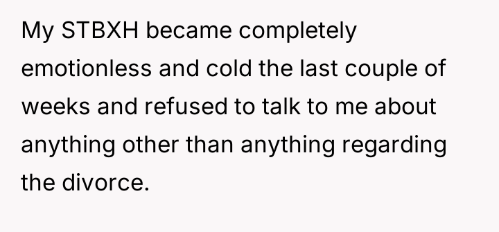 The original poster (OP) details the severe breakdown of her marriage, which has resulted in official divorce proceedings. Key figures in this situation are the OP, her now estranged husband (STBXH), her daughter, and her family. The central event that precipitated the current crisis appears to be a video or incident involving the husband, after which the OP's family began accusing him, leading to the husband becoming completely withdrawn and emotionally distant.