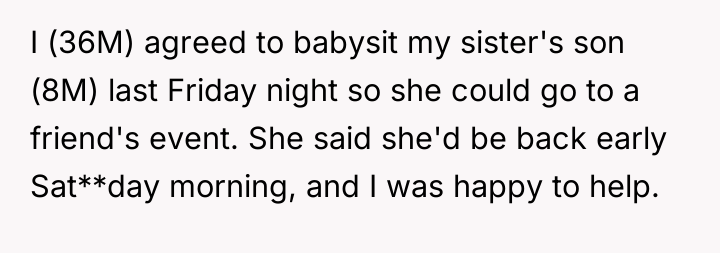The original poster (OP), a 36-year-old man, agreed to watch his 8-year-old nephew for his sister last Friday night, expecting her to return early Saturday morning. The OP was looking forward to the time spent with his nephew and had planned activities for them.