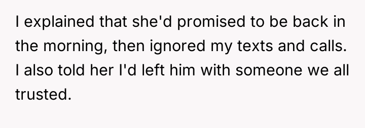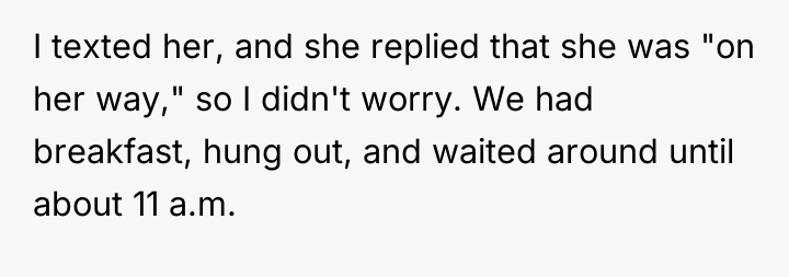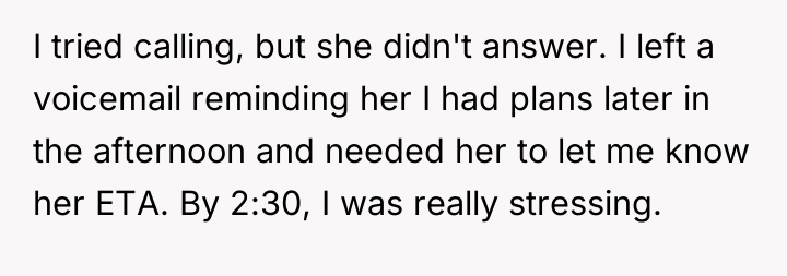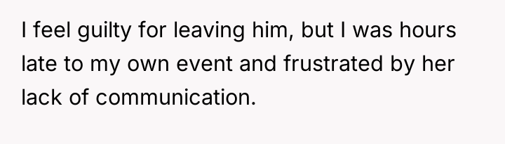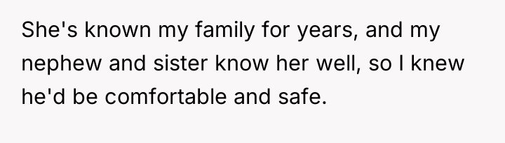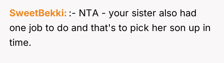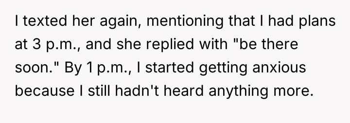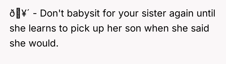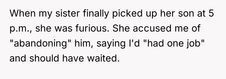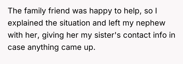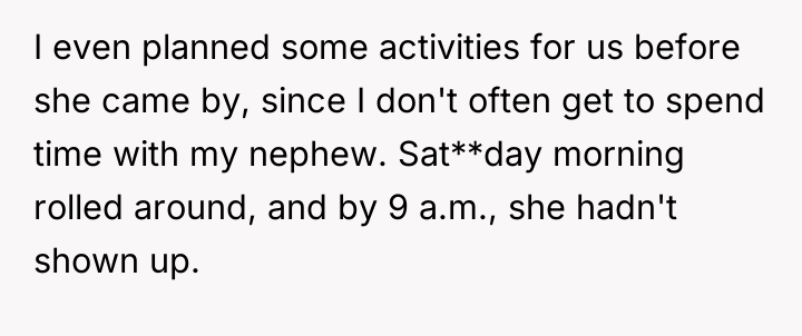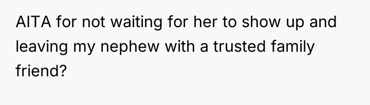 When Saturday morning passed without his sister returning by 9 a.m., the OP communicated his schedule constraints, noting he had plans at 3 p.m. After receiving vague updates and eventually no response to calls or texts by mid-afternoon, the OP made arrangements for a trusted family friend to care for his nephew so he could attend his commitment. When the sister finally collected the child at 5 p.m., she was angry, accusing the OP of abandonment and insisting he should have waited all day. The OP now questions if he was wrong for prioritizing his commitments over waiting indefinitely.