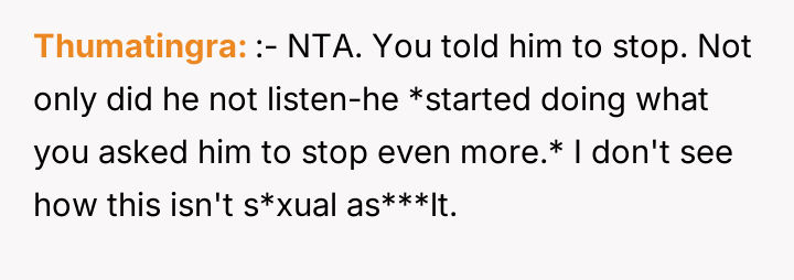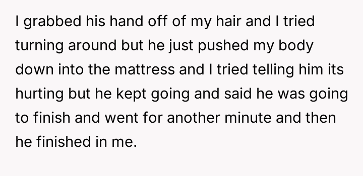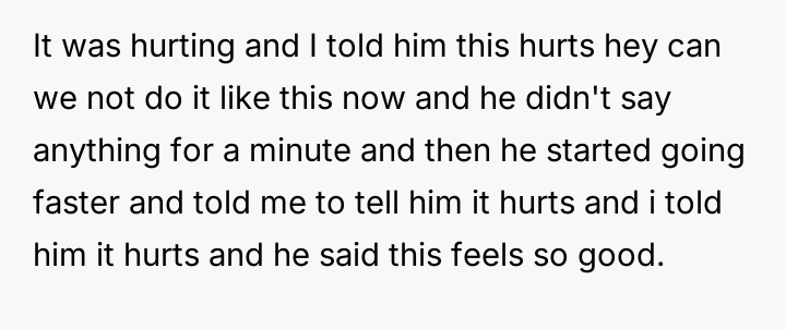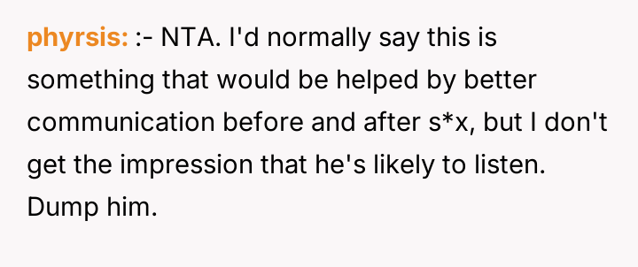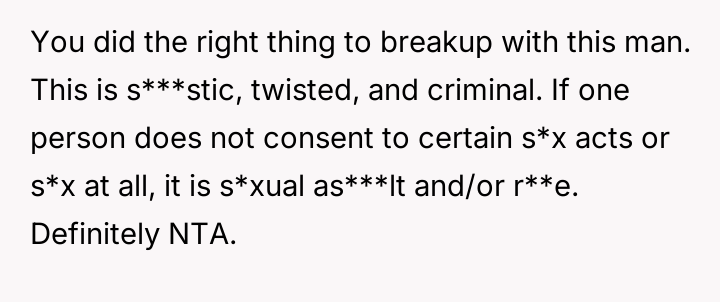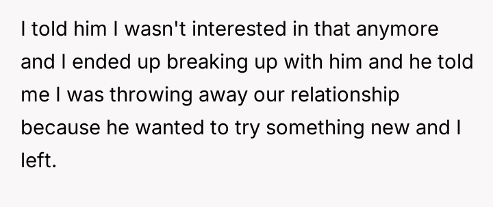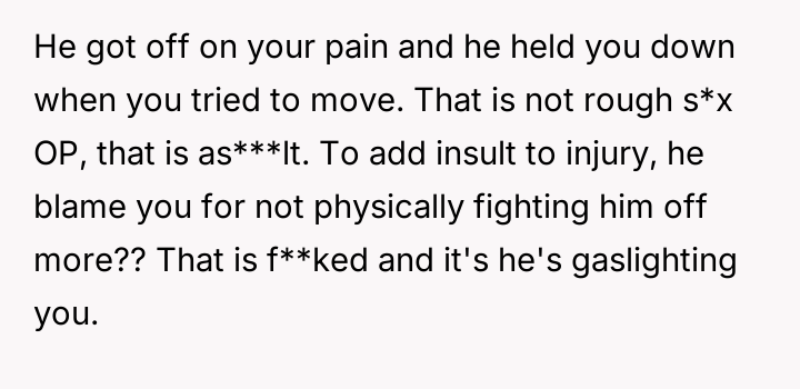 During one specific s*xual encounter, the boyfriend engaged in actions that caused the OP physical pain, specifically when she verbally expressed that it hurt and requested he stop the current activity. When the OP tried to stop him, he allegedly restrained her and continued until he finished, after which he expressed high satisfaction while she felt pain and distress. The OP subsequently ended the relationship, leading to the boyfriend claiming she was overreacting and ruining the relationship by refusing to try new things.