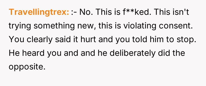 The core conflict revolves around the OP's clearly communicated boundaries regarding physical safety and pain during sex, which were ignored by her boyfriend in pursuit of his own pleasure. While the boyfriend suggested the OP did not stop him actively enough and that her reaction was due to inexperience, the OP firmly stated that the experience was painful and she did not want to repeat it.