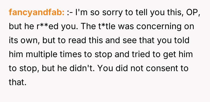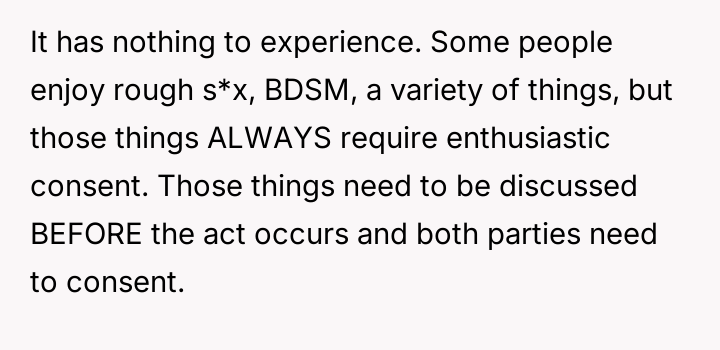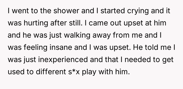 The boyfriend's actions moved beyond consensual kink exploration and entered the territory of non-consensual behavior when the OP explicitly said the act hurt and asked him to stop. In sexual dynamics, verbal communication of pain or discomfort overrides any prior assumption of consent for that specific act. The boyfriend's justification—that the OP did not physically resist enough or that she was 'inexperienced'—is a common deflection tactic used when boundaries are crossed. It shifts the responsibility for stopping the unwanted action onto the person being harmed, rather than recognizing his failure to respect the communicated boundary.