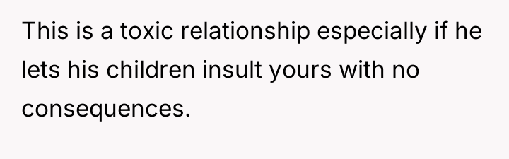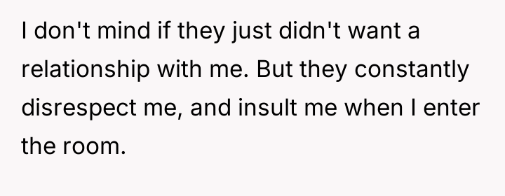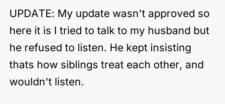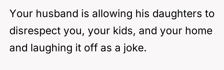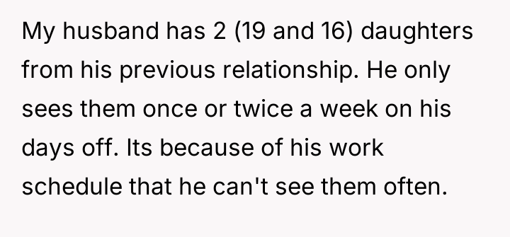 In my opinion, while the husband's work schedule is a factor, it doesn't excuse allowing such harmful behavior to persist. Boundaries and mutual respect are essential for any family to thrive, and it seems the stepdaughters’ actions are deeply impacting everyone involved. The OP deserves support, and the husband must actively work to balance his relationships and ensure his home is a safe, respectful place for all his children. Without that, resentment and hurt will only grow.