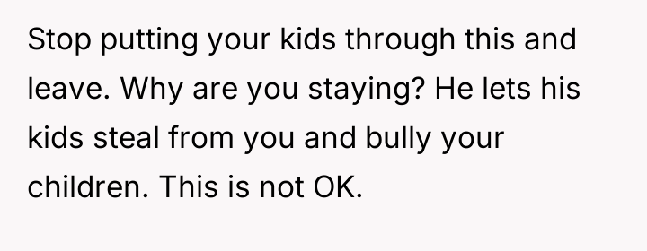 After reading through the Reddit comments, it's clear that many readers empathize with the OP's difficult position. Blended families can be challenging, especially when past relationships and limited time together create tension. Most commenters agree that the disrespect and stealing are unacceptable, and that the husband needs to take a firmer stand to protect his current family and foster a healthier environment. Several suggest family counseling or mediated conversations to address the underlying issues and improve communication.